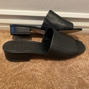 Stylish black slide sandals with a textured design. They are new with the Nordstrom Rack sticker on the sole but no box. Man made material. 1 1/4” heel. Has some stretch for comfort. Thank you for considering my item. 🌷