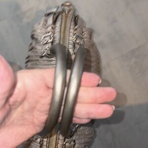 Front and back top of bag have double belt, buckle decor/loops sides have D rings for Chain or perhaps Crossbody chain you might want to add, or just add an extension. Please inquire if interested.