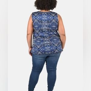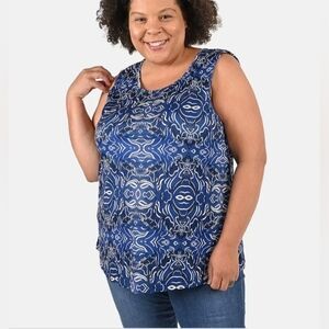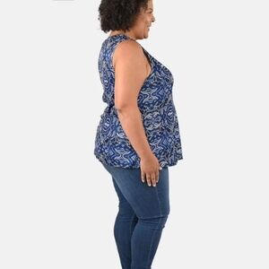 Elevate your wardrobe with this stylish blue patterned sleeveless top. Perfect for any occasion, this top offers both comfort and elegance.