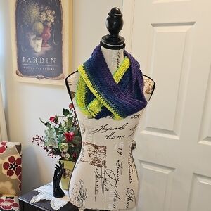 Stylish knit infinity scarf in vibrant purple and yellow. Light enough to be worn year-round. Perfect for adding a pop of color to any outfit.