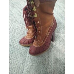 Elevate your style with these stunning Michael Kors leather heeled boots. The solid brown color and lace-up closure make them perfect for any occasion, whether it be travel, a party, a casual day out, workwear, or even for business. The ultra-high block heel is sure to turn heads and add some extra height.