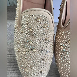 Good used condition, size 6. A little dark discoloration on the front where creases are and just need to be cleaned. Other than that there are a couple of missing stones/studs on the right front toe. Super cute and great to pair with jeans or for work.