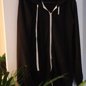 Stylish black zip-up hoodie featuring white drawstrings. Perfect for casual wear.