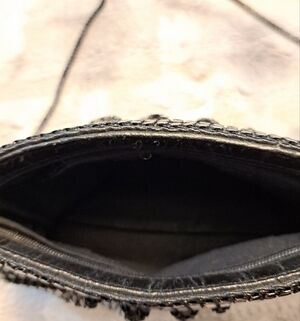 covered in sequin, this bag is 9" wide by 6" long, strap is 42", zipper closure, inside has one zipper pocket
