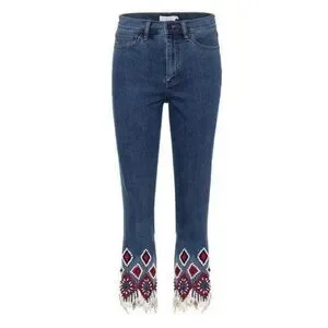 Tory Burch Mia jeans featuring a high-rise, zipper fly, 5-pocket styling, cropped, straight legs, stretch cotton blend fabric, and intricate beaded and embroidered detailing at the cuffs with shell fringe.