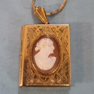 Vintage goldtone cameo locket jewelry set featuring a locket and matching earrings. Perfect for adding a touch of vintage charm to any outfit. chain measures 24 in