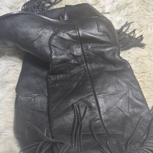 Chic black leather boots with fringe detail. Stylish heeled design. Perfect for any occasion. please see pictures the side fringe were removed