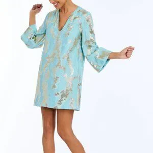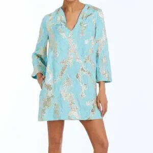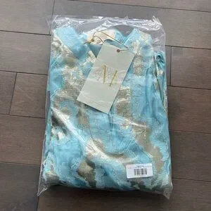 Brand new in original packaging blue metallic gold jacquard Mestiza Ines mini dress. Women's size large - sold out size.