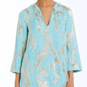 Caftan-style mini dress crafted in a metallic jacquard fabric