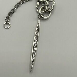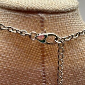 Stylish silver necklace with clover and feather charms. Perfect for any occasion.