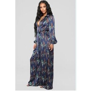 Fashion Nova The Entertainer Satin Jumpsuit Navy Sz XS Chain Tassel Print Rodeo