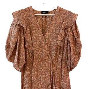 NEW THE KOOPLES Women Mini Silk Dress Paisley Lurex V-Neck Puff Sleeve Wrap