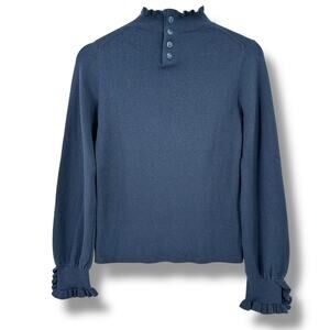 Margaret O'Leary Leila Button Cuff Ruffled Mock Neck Sweater Sz S Slate Blue