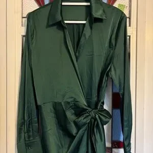 Satin Long Sleeve Wrap Blouse in Hunter Green