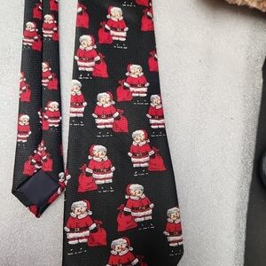 Celebrate the holidays with this festive black tie featuring a cheerful Santa design. Perfect for adding a touch of holiday spirit to your attire.