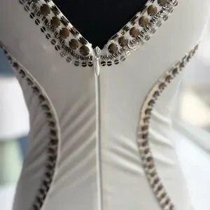 Sexy cream bodycon sleeveless midi dress with a deep V-neck. Featuring eye-catching gold details. Ideal for a modern look. Partner with a blazer, a cardigan or wear by itself. Great for the holidays ever for any occasion where you want to look your sexy best! Add a denim jacket and boots and make it a great western option!