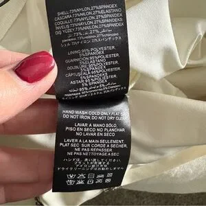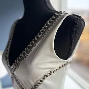 Details: fully lined, zipper, back closure, sleeveless, stretchy, deep V in front and back