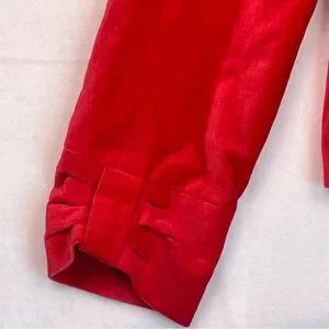 The Apostrophe Luxury Blazer is a stylish and versatile piece for women, perfect for business or party occasions. This red blazer features a notched lapel, one-button closure, and long sleeves with bow designs on the cuffs and pockets. Lined with 100% polyester and made from a cotton blend fabric, this blazer has a regular fit and a short length, making it a statement piece for the winter and fall seasons. The festive and colorful design adds a touch of bohemian and preppy style to any outfit, making it a perfect choice for special occasions and office attire.