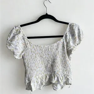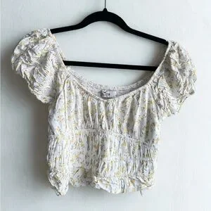 Hollister white and yellow floral puff-sleeve smocked crop top