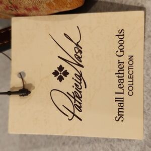 Patricia Nash Valerie wristlet clutch. Genuine leather, in Prairie Rose Floral, hidden magnetic fold over top with zipper closure, antique brass hardware, brown suede like lining with a leather embossed label inside. Inside has a zipper pocket and two elastic pockets, removable wrist strap. When fully open its approx. 8"H, 8.5" W, 3"D. When folded over its 5"H. NWT
