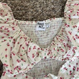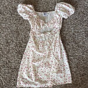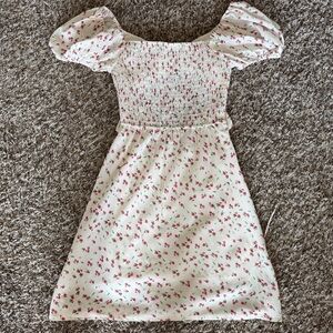 Romantic and feminine, this cream mini dress is covered in a dainty red floral print with puff sleeves, an open cut-out waist, and stretchy shirred back for a flattering fit. Features adjustable ties and a soft lightweight fabric—perfect for brunch dates or sunny days out!