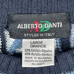 Alberto Danti mens sweater in a size large showcasing a striking Italian style with a multi-striped pattern. This pullover features a crew neck and long sleeves, crafted for a unique textured look. Perfect for elevating casual outfits or adding flair to a night out.