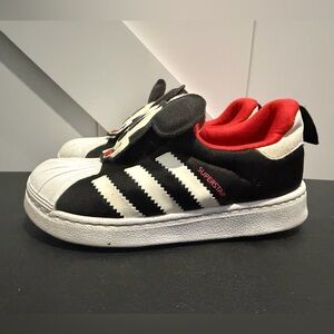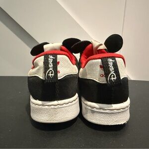 Fun Adidas sneakers with Mickey design. Black and white with red accents. Comfortable and playful.