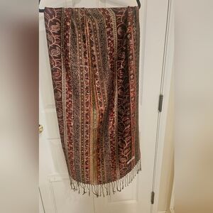 Elegant pashmina scarf with intricate patterns. Rich brown and orange tones shot through with gold.
