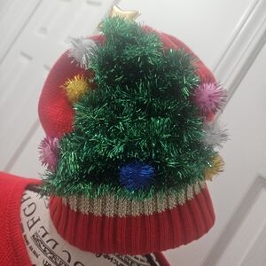 Bright red poncho with a matching hat from Collection Eighteen. Features a green foil christmas tree on the poncho front and on the matching hat.Perfect for festive holiday occasions.