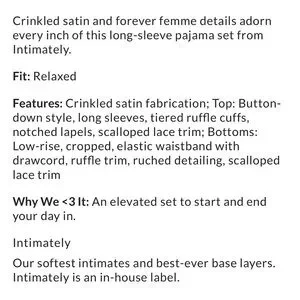 Gorgeous crinkled satin in gray,blues and greens with ruffled cuffs at wrists and ankles. Lace trimming, elastic waist with tie. NWT. See above for more details