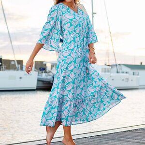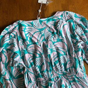 Mary Square breezy "Melissa Dress" in women's size Small. Color is called "Sail Away Pink" in teal or aqua with pale pink-lavender pattern. 100% viscose textured fabric, high-quality and substantial but also lightweight and flowy. Little fabric-covered buttons up the front and stretchy gathered waistline. Beautiful for vacations and everyday wear. NWT, slightly rumpled from shipping.