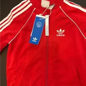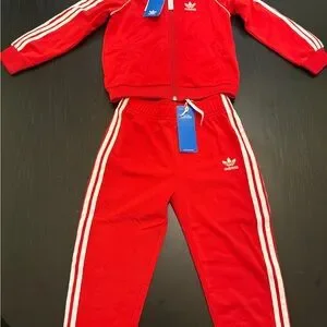 Vibrant red Adidas tracksuit with classic white details. Ideal for everyday comfort.
