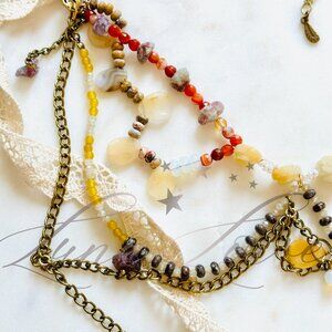 FREE PEOPLE x Ariana Ost Semi Precious Stone Body Chain. This is an EXCLUSIVE - UNRELEASED. This piece features delicate metalwork that drapes gracefully over your body, with golden hues that capture the essence of a setting sun. Hand-selected gemstones are carefully embedded within the design, each chosen for their healing properties, meant to enhance your energy and bring a sense of calm and balance to your look. Please note the modeled photo may not depict exact design - please see all photos.