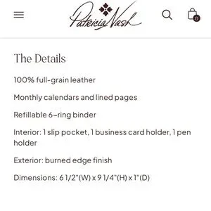 This is a beautiful, well made agenda/planner by Patricia Nash. One of the last images shows the size but I think it's considered A5, so you can easily order calendars or pages to fit. It's a great size, not too big but not too small. Only reason I'm selling is because I bought a different one I use now. Excellent condition. Ring works, snap works, no odors or flaws that I see. Also includes several packs of new Patricia Nash lined paper to fit. You can buy the yearly calendar inserts in Patricia Nash's website for $12. Great time to start your planning for next year!