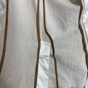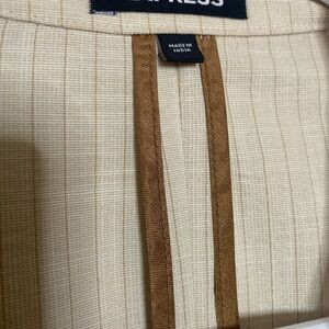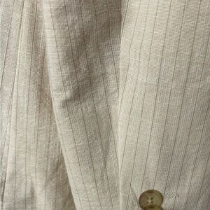 Stylish beige blazer with subtle stripes. Ideal for formal events. Features two-button design.