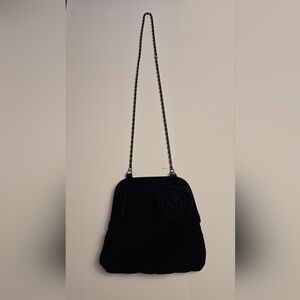 Murval navy velvet purse with rosette. Measures approx. 8" H x 8 1/2" W x 1 1/2" D. Box chain has 19 1/2" drop. Has one flaw in chain as shown in pictures.