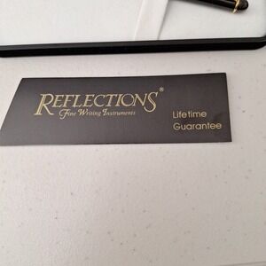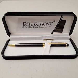 5.5" length. The Vtg Reflections Fine Writing Instrument Pen is a vintage piece from the United States that is made of plastic. This pen features a sleek black and gold design, making it a stylish and elegant choice for those who appreciate fine writing instruments. It comes in its original gift case, adding to its collectible value and making it a perfect gift for pen enthusiasts or collectors of vintage items. The Reflections brand ensures quality and craftsmanship in this timeless piece.