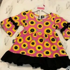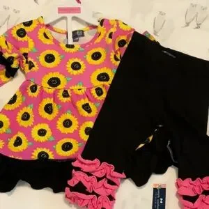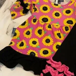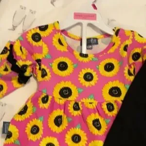 Simply Southern girls outfit. Vibrant pink dress and pants, with a sunflower pattern. Features black ruffle accents.