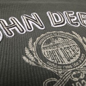 John Deere tractor company waffle weave thermal shirt. Dark green with embroidered design on chest. Long sleeves, round neckline.