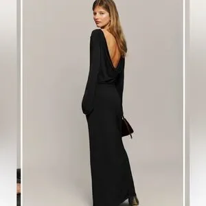 Chic black maxi dress with deep back. Long sleeves for a sophisticated look.