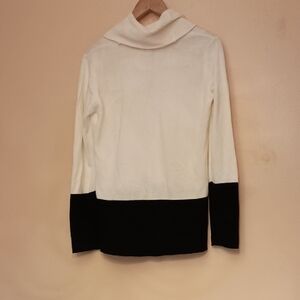 Chic cowl neck sweater in classic white and black, sz M. Ideal for versatile styling. Approx measurements: pit to pit 20", shoulder to bottom hem 26". There's ribbing on the cowl neck and on the black parts of the sweater!