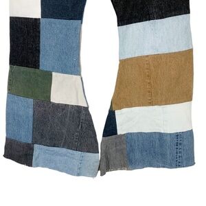 Features: these are a 100% rigid denim cotton fabric. These pants are custom made from many different Levi jeans and created to be an amazing hippie bohemian flare leg masterpiece. Pockets. Zip to button closure.