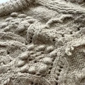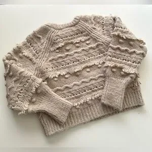 Product Specifications/Dimensions (while laying flat): * Size: Small * Chest (armpit to armpit): 19 in. * Sleeve: 23 in. * Length: 19.5 in. * Acrylic/polyester/wool/mohair blend * Beige solid color * Round neck * Pullover style * Floral/ruffle textured detail * Open/chunky/rib knit * Long sleeve