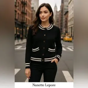 Classic and polished, this Nanette Lepore cardigan features a varsity-inspired design in black with cream contrast trim and gold-tone snap buttons. Crafted with a soft knit feel and flattering structure, it pairs beautifully with black pants or a sleek skirt for a modern city-chic look.