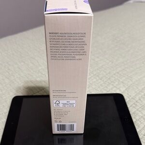 Elegant cream packaging with gold logo. Features a purple geometric design.
