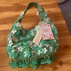 This bag is a top-handle style with green and white floral pattern and beaded fringe at the base. It is handcrafted and made in India. Its unique design makes this bag suitable for special events like weddings and parties.