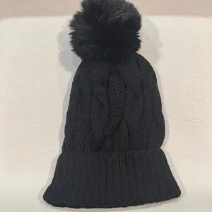 UGG NWT Accessories. Cable Knit Beanie with Faux Fur Pom. Color: Black