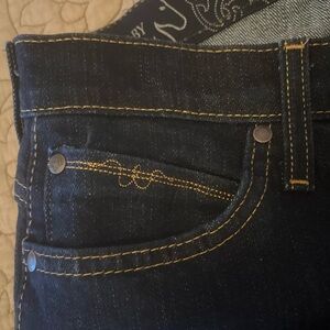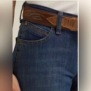 The Ultimate Riding Jean in a dark wash color, Q Baby fit, and boot cut leg from Wrangler. Beautiful, unworn, unwashed.