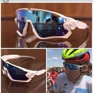 Sleek Oakley sunglasses featuring a polished white frame. Equipped with sapphire lenses for a bold look.
