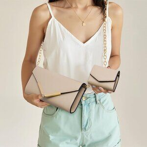 Leather 2-Piece Envelope Clutch & Wallet Set Chain Strap Evening Party Bag